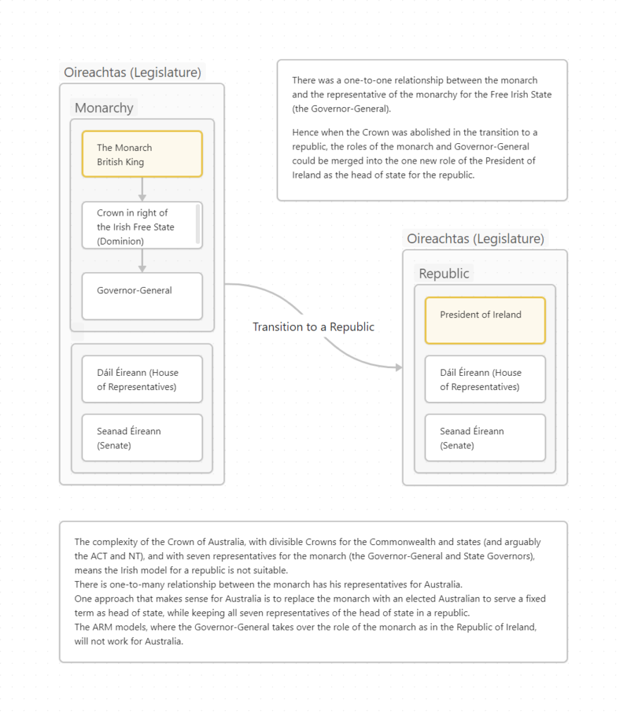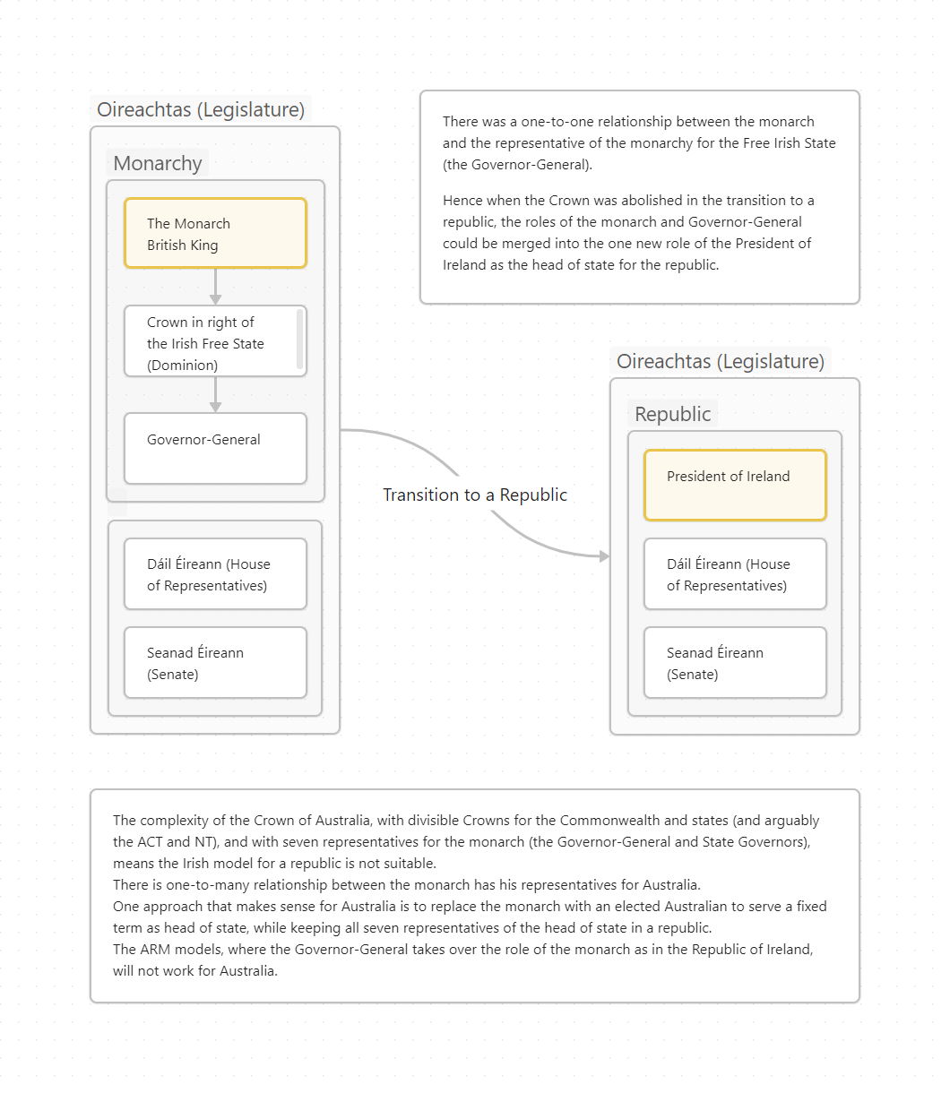 The model for the Republic of Ireland will not work for Australia. The proposals by the ARM for the 1999 referendum and the Australia Choice Model take their inspiration from the Irish model and will not work.