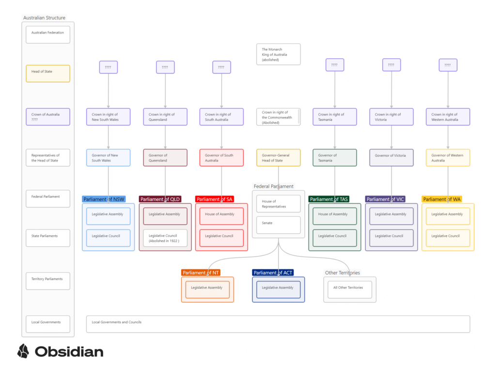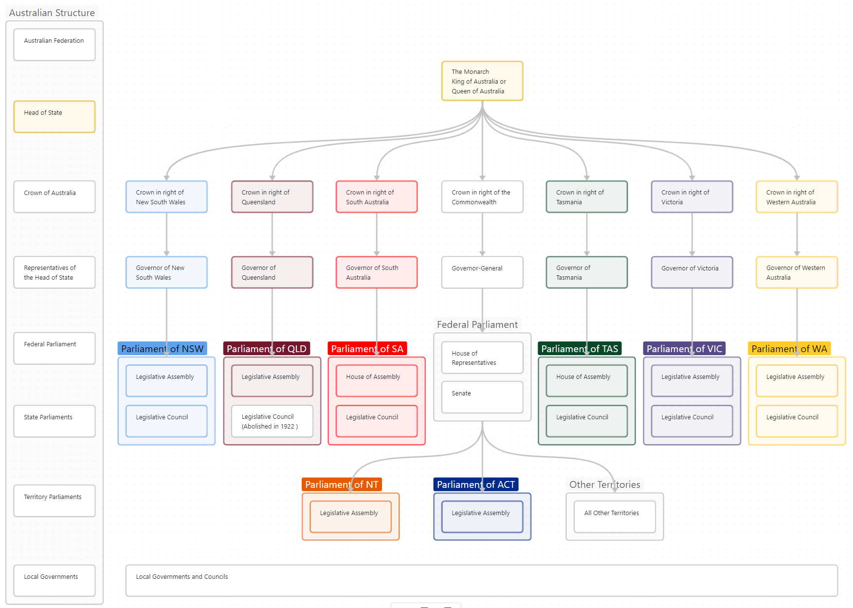 Federation and Crown: After the 1901 Federation, Australia operated under the British Crown. It’s a constitutional monarchy with a Westminster system consisting of federal, state, and local governments.