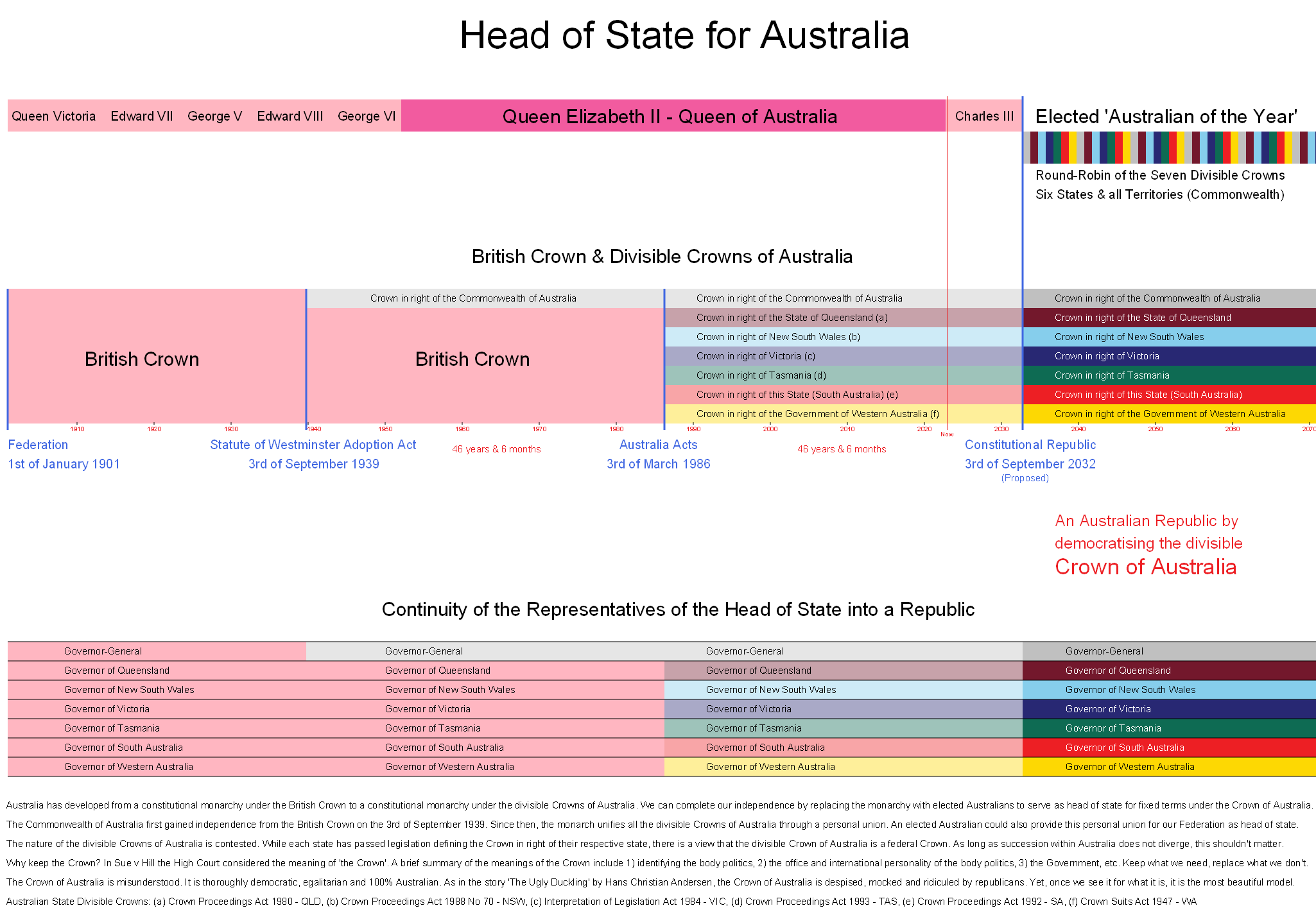 Single Head of State: One person will serve as the head of state for all of Australia, unifying the Federation and reflecting the personal unity of the divisible Crowns of Australia.