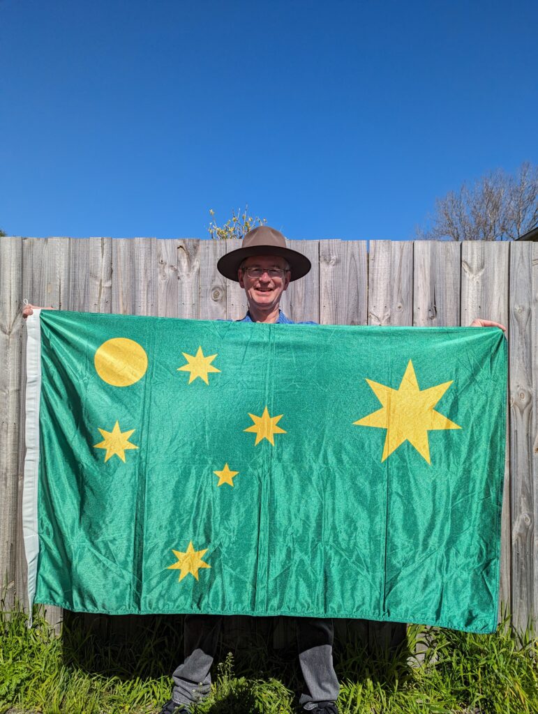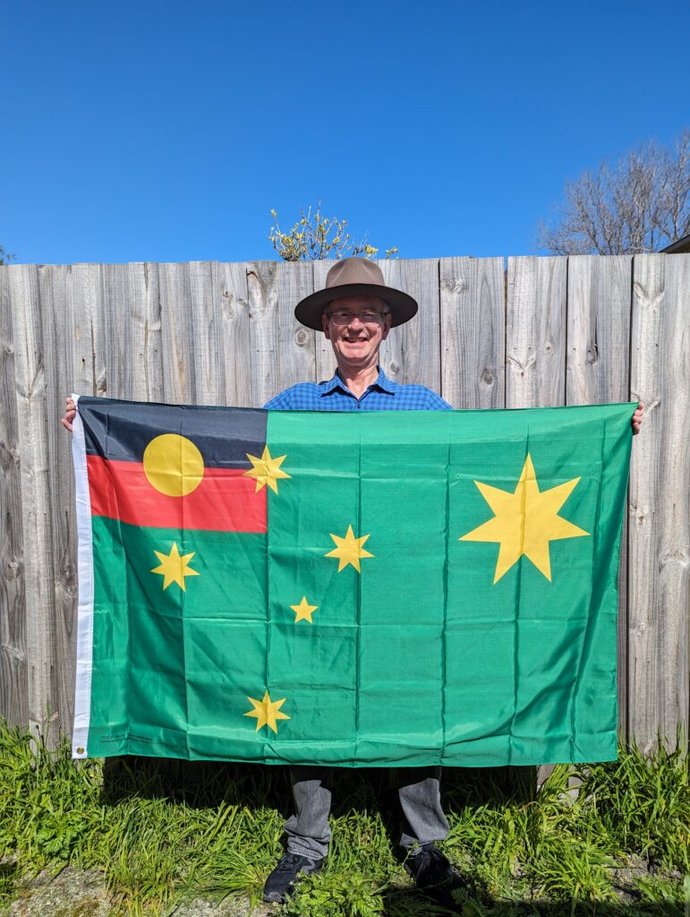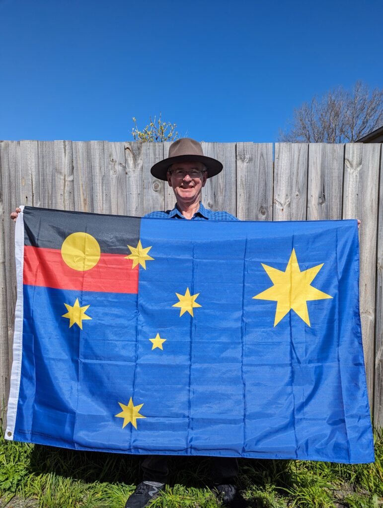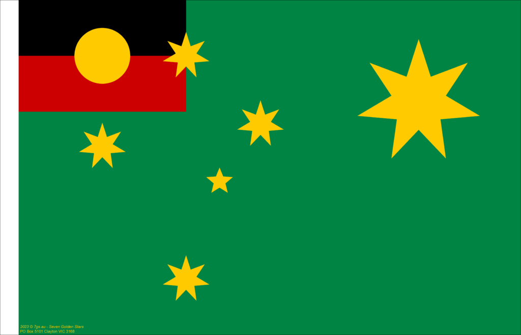This 7gs flag has a blue background and gold stars. The colours of the Aboriginal Flag are included in the canton. The size of the flag is 150 x 100cm,
